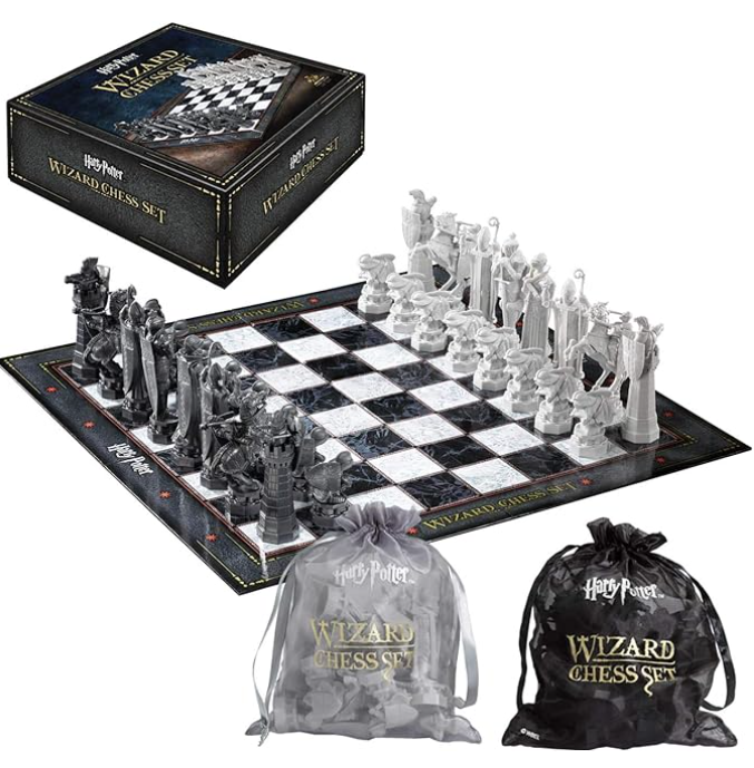 Each set includes a themed chess board, a full set of wizard-style chess pieces, and storage bags to keep everything organized and protected.